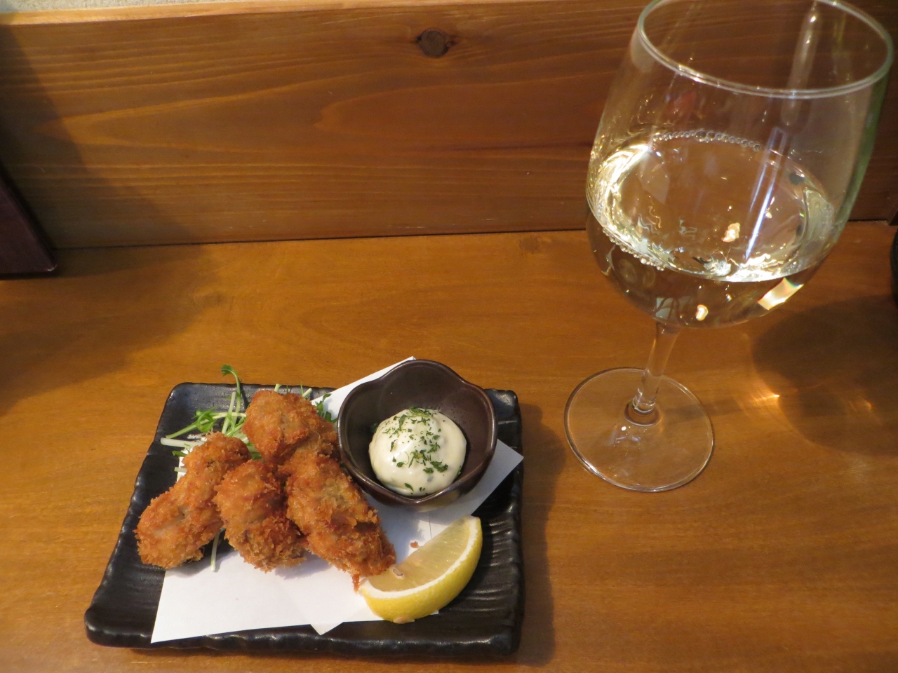 大丸京都店からすぐの錦市場の入口近くにあるお店です。ランチに白ワインと一緒に魚介類を食べるのは至福の喜び。この日は牡蠣のフライを白ワインを飲みながら食べました。一人でも入れる居酒屋のような雰囲気で悩まずにお店に入れます。女性客や年配のカップルが多いので安心出来ます。白ワインはグラス400円ですが樽の香りがして美味しいです。