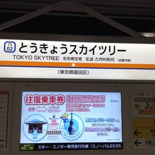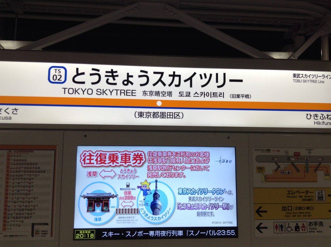 浅草から隅田川を渡ると、とうきょうスカイツリー駅です。浅草を観光した後、あるいはスカイツリーの後浅草へ行く場合は東武スカイツリー線を利用するのが一番便利かと思います。駅にはトイレ、エスカレーター、エレベーターもあるので便利です。ただ、駅のホームは狭いのでご注意ください。余談ですが、以前は、東武伊勢崎線業平橋駅という名称でした。