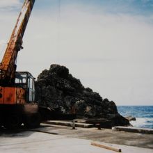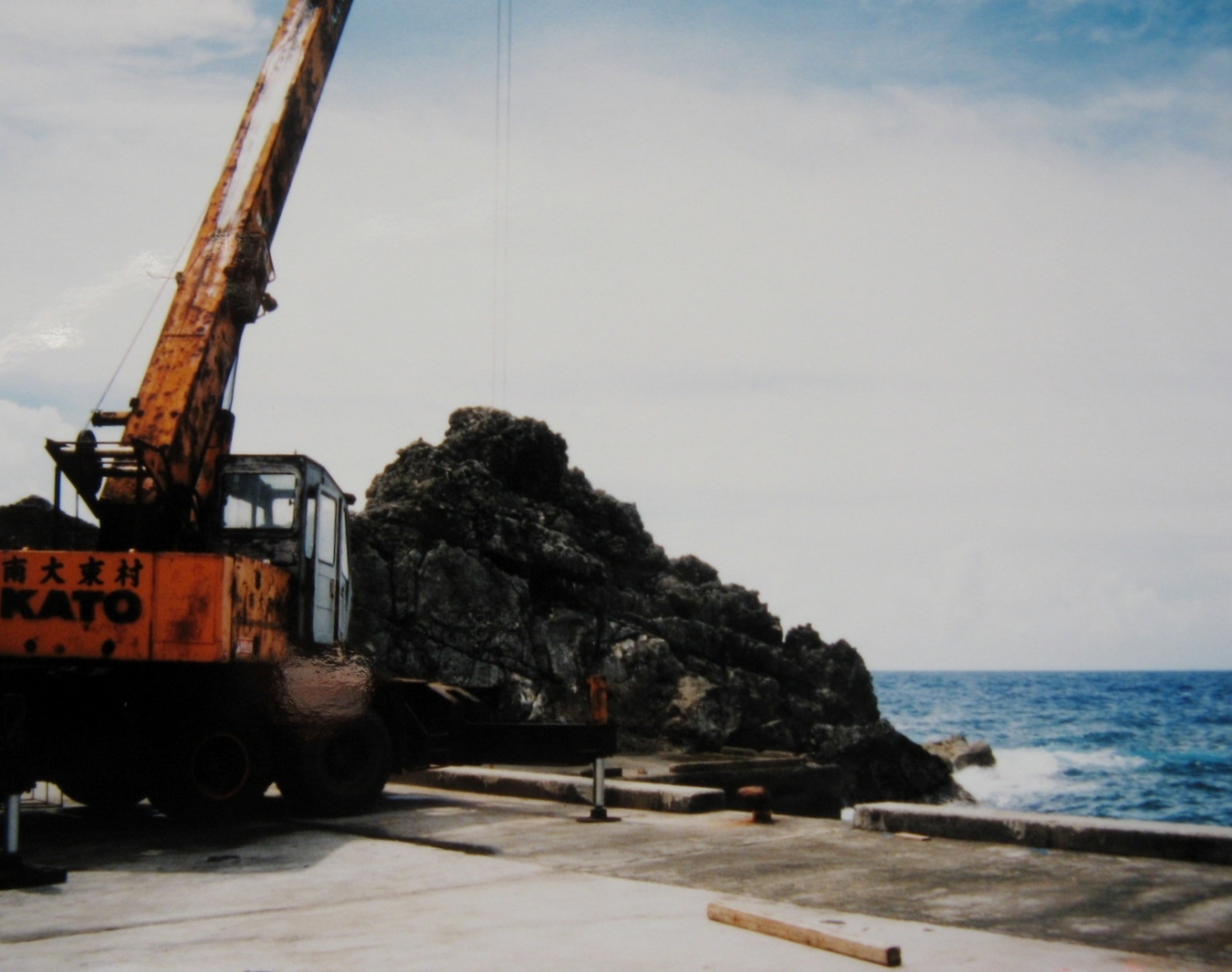 南大東島のメインの港です。南大東島の周囲は断崖絶壁で、海が荒れやすいということもあってフェリーが直接港に接岸できないので、島への上陸やフェリーへの乗船にはクレーンで吊られて行われます。小さな漁船も台車に乗せられて、車でクレーンのそばまで引いてきた後、クレーンで吊り上げられて海に下ろされます。他では、経験できない面白い風景です。港の上には待合室もあります。