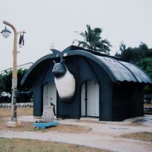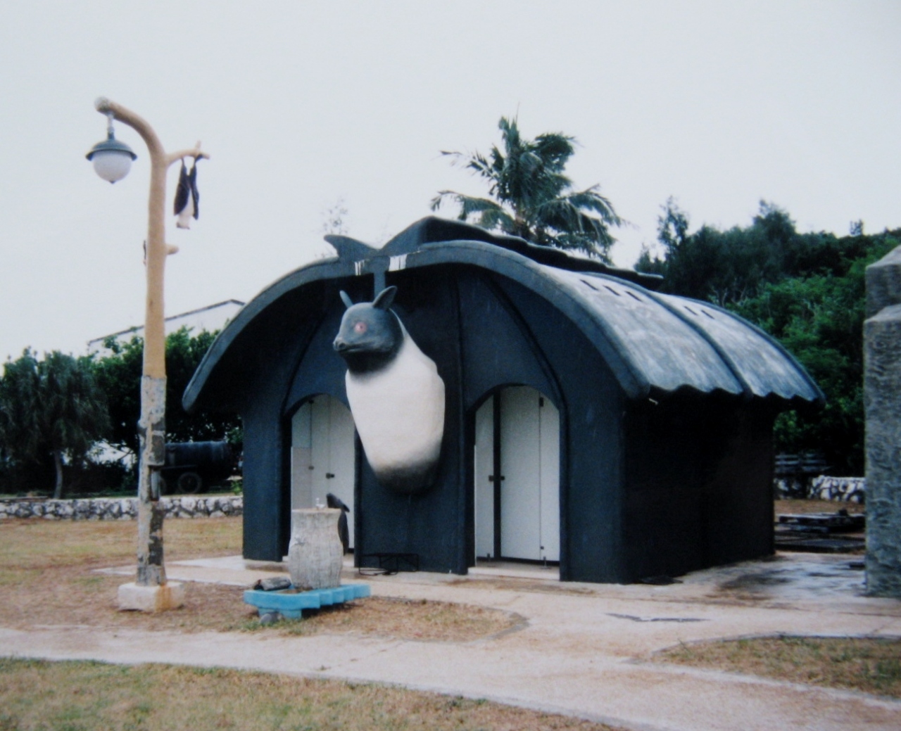 「コウモリ公園キャンプ場」は、大東島の西、西港の近くにあります。キャンプ場は芝生で覆われていて結構な広さはありますが、海は見えず眺望はそれほど良くありません。キャンプ場内のシャワー室やトイレ、街灯などは、国の天然記念物にも指定されている“ダイトウオオコウモリ”をモチーフにしたオブジェで飾られています。利用に当たっては、役場に申し込む必要があります。