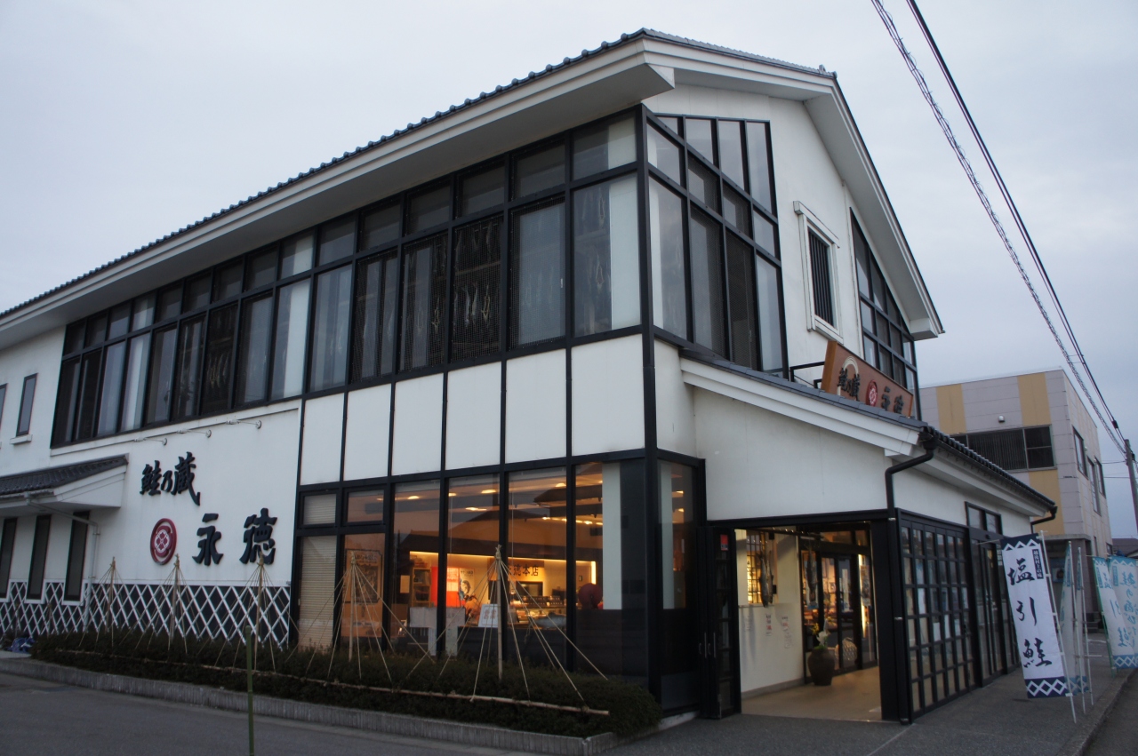 鮭乃蔵永徳本店は、イヨボヤ会館からすぐの国道沿い。村上の鮭の加工品を扱う大手の販売所です。しかし、これだけたくさんの鮭があって、それが全部村上で獲れているんですかと聞くと、「村上で獲れる鮭は限られていて、北海道からも入れています。当社も北海道に拠点を持っています」との答え。ただ、屋外で鮭を干すと凍ってしまうので、村上のようにはいかないんだとか。村上は風も強いし、塩引きや酒びたしの加工には、やはり村上が適しているんだそうです。いろいろ勉強になりました。
