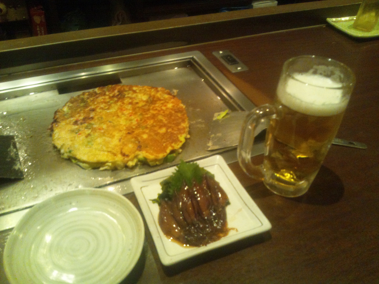 日によって「お好み焼きorビール半額」か「もんじゃ焼きorビール半額」をやっているので、ほぼ毎日ビールが半額で飲めます。