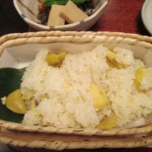 竹かごに入ったあたたかい栗おこわはほっとする味