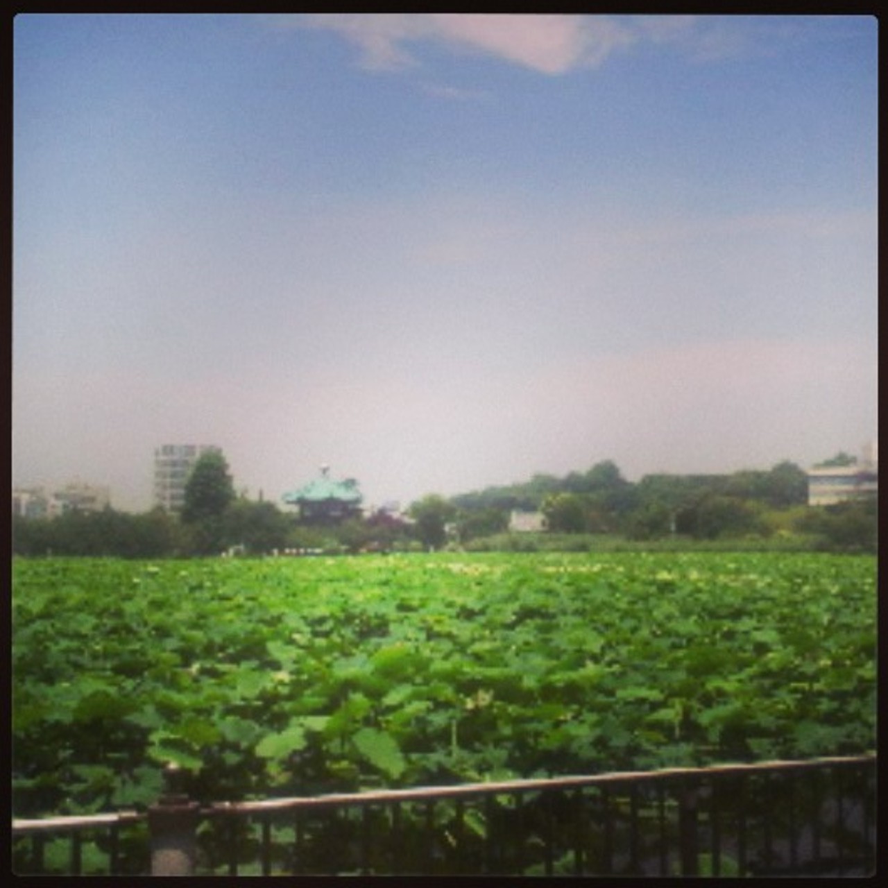 都会とは思えないほどの田園風景が広がる不忍池。初夏には蓮の花が咲き乱れます。週末には屋台が出、にぎやかになります。が、せっかくの風流な景色なのに、近年の都市再開発で池の周りを高層ビルが取り囲んでしまい、魅力半減です。