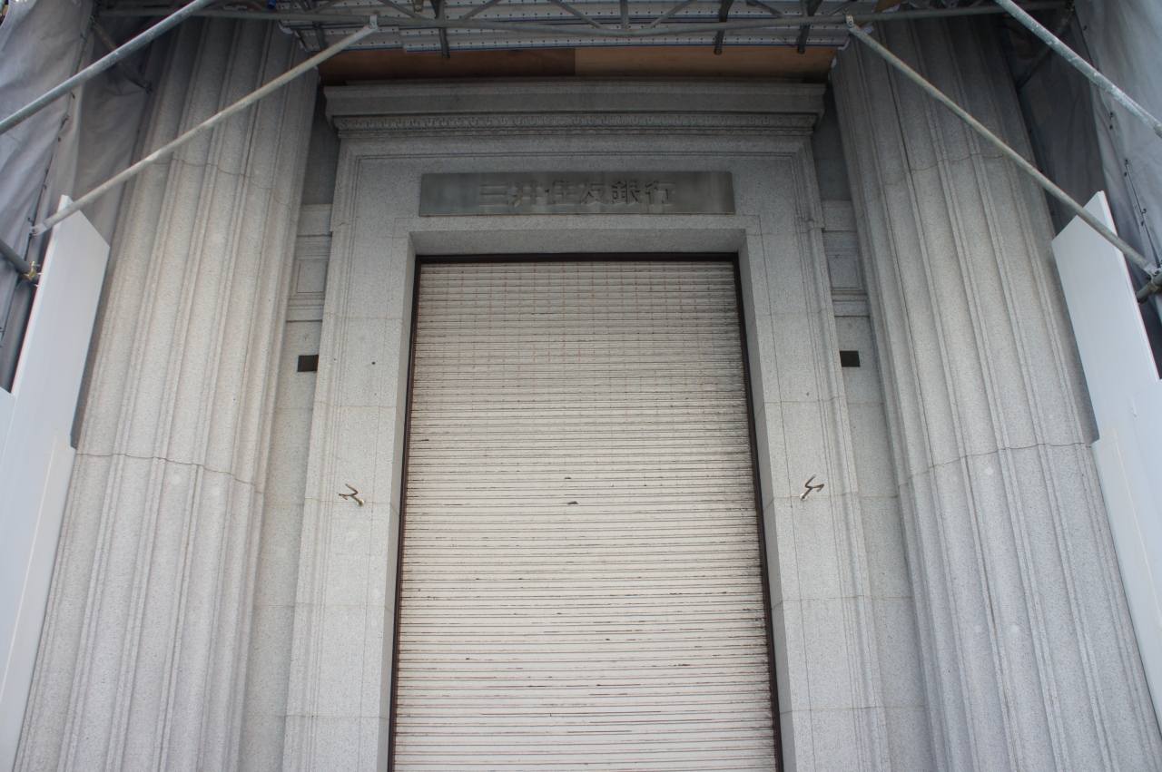 旧三井銀行横浜支店は、 昭和6年に建てられました。現在も、三井住友銀行として現役ですが、ただいま工事中です。