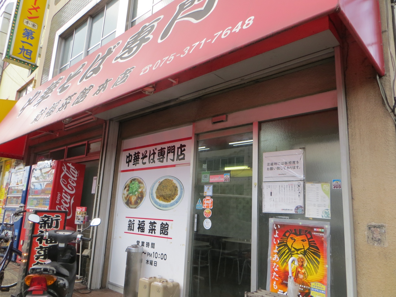 京都の超有名ラーメン店の新福菜館はJR京都駅から東へ徒歩10分程、こちらも超有名店ですが第一旭と並んでいます。朝早くから開いているようです。ここのラーメンの特徴はスープが黒いこと。でも結構こってりしていて美味。どのように作られているのか不思議です。中華そばのミニサイズ550円は女性にうれしい。いつも混んでいますが、2Fもあるので並ばなくてもすむかも。