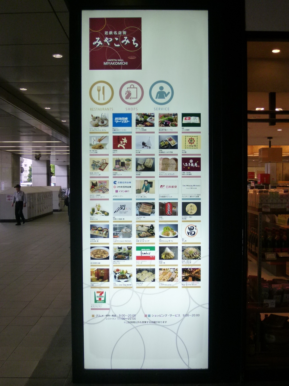 「近鉄名店街 みやこみち」は、名の通り、京都駅の八条口の西、近鉄側にあります。カフェや居酒屋、レストラン、和食、中華など多種のメニューがありますよ。通勤や出張前の利用者が多いのでしょうか、カフェは朝早くからオープンしています。私は、串焼きビールセットをいただきました。