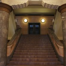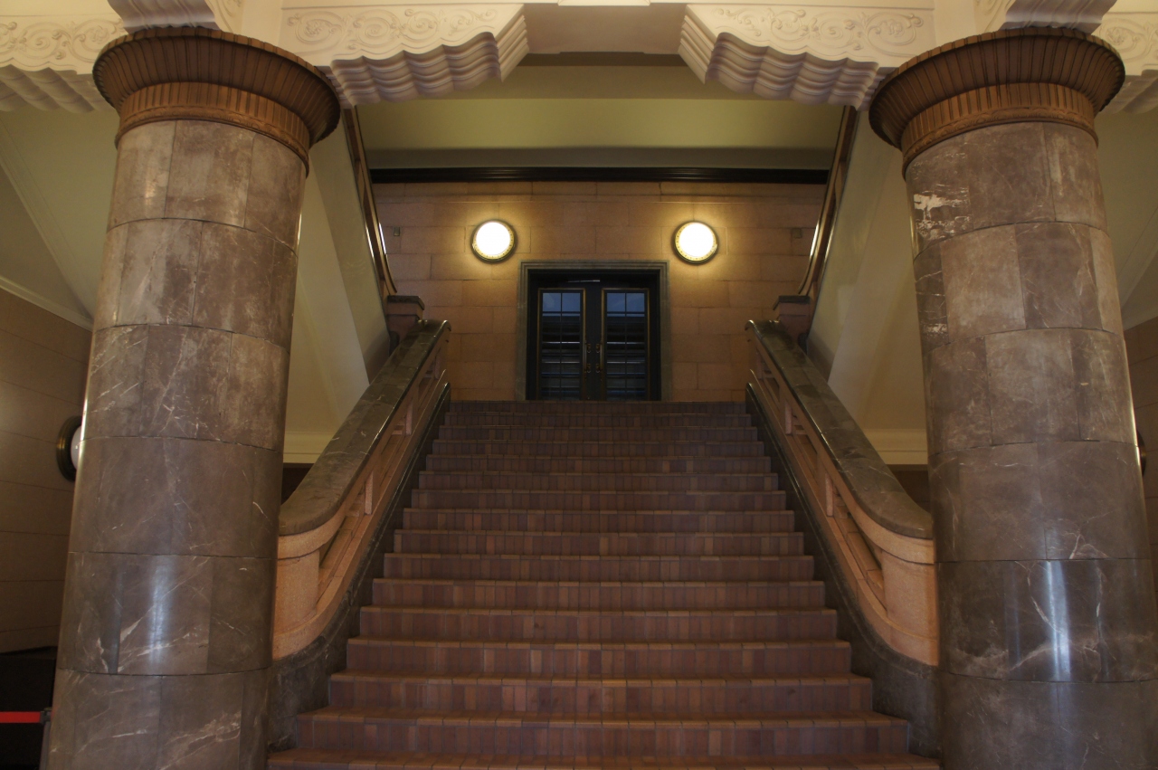 横浜情報文化センターは、かつての横浜商工奨励館。関東大震災後の横浜の商工業復興を目的に建てられた施設です。昭和4年に完成。現在の建物は、旧館部分を周辺に残し、新しいビルは敷地中央部に建てているので、玄関を入ると当時の重厚な雰囲気を感じることができます。