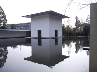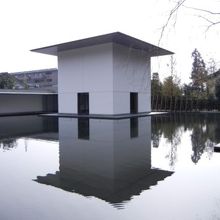 「水鏡の庭」に浮かぶ「思索空間棟」が印象的で