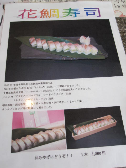 お寿司では、お持ち帰りにも出来る銚子名物「花鯛寿司」は絶品です。
