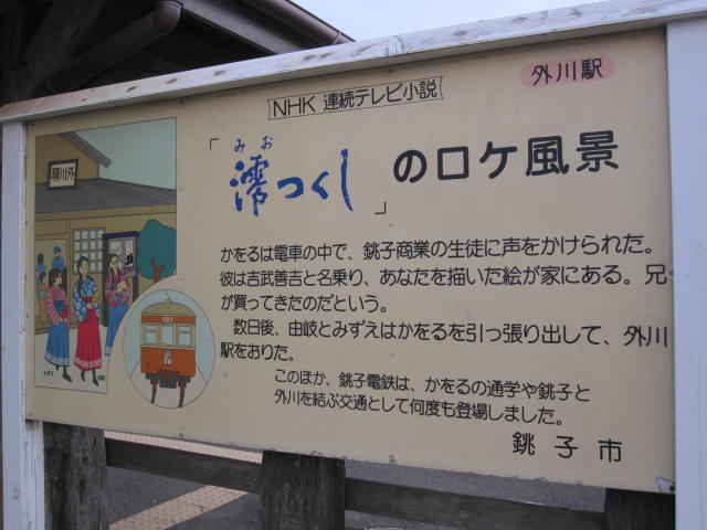 NHKの朝の連続テレビ小説『澪つくし』のロケ地となり、そのことを伝える看板が駅前に立っていました。