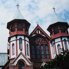 “明治村”の正面入り口から入って右手の小高い丘の上に建っています。明治40年(1907年)に京都河原町に建てられた京都五条教会で、二階が会堂に、一階が日曜学校や幼稚園に使われていたそうです。建物は、一階がレンガ造りで、二階が木造という非常に珍しい構造になって、正面左右に高い尖塔を持つロマネスク様式の建物は素晴らしいデザインです。内部は、開放感があっていい雰囲気でした。