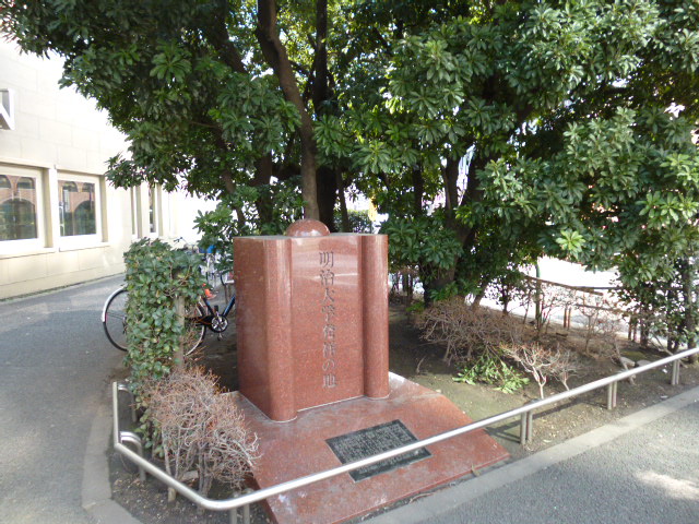 有楽町の交差点のすぐ近く、ニュートーキョーのビルの前に「明治大学発祥の地」の石碑があります。何十回となく通っている場所ですが、ここにこんな石碑があったことに、初めて気づきました。