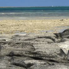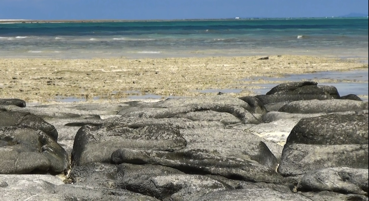 奥武島のビーチですが亀の甲羅のような石が並んでいる場所が畳石です。