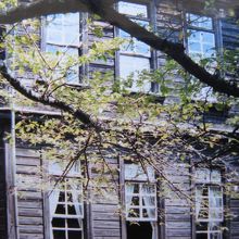 “明治村”の正面入り口から入ってすぐのところに建っています。明治42年(1909年)に建てられたもので、洋館と和館が繋がったような形で、学習院長という公的な場面は洋館部を使って、私的な生活は日本座敷を用いていたのは面白いと思いました。玄関の屋根の桜の花弁の飾りも見所の一つです。