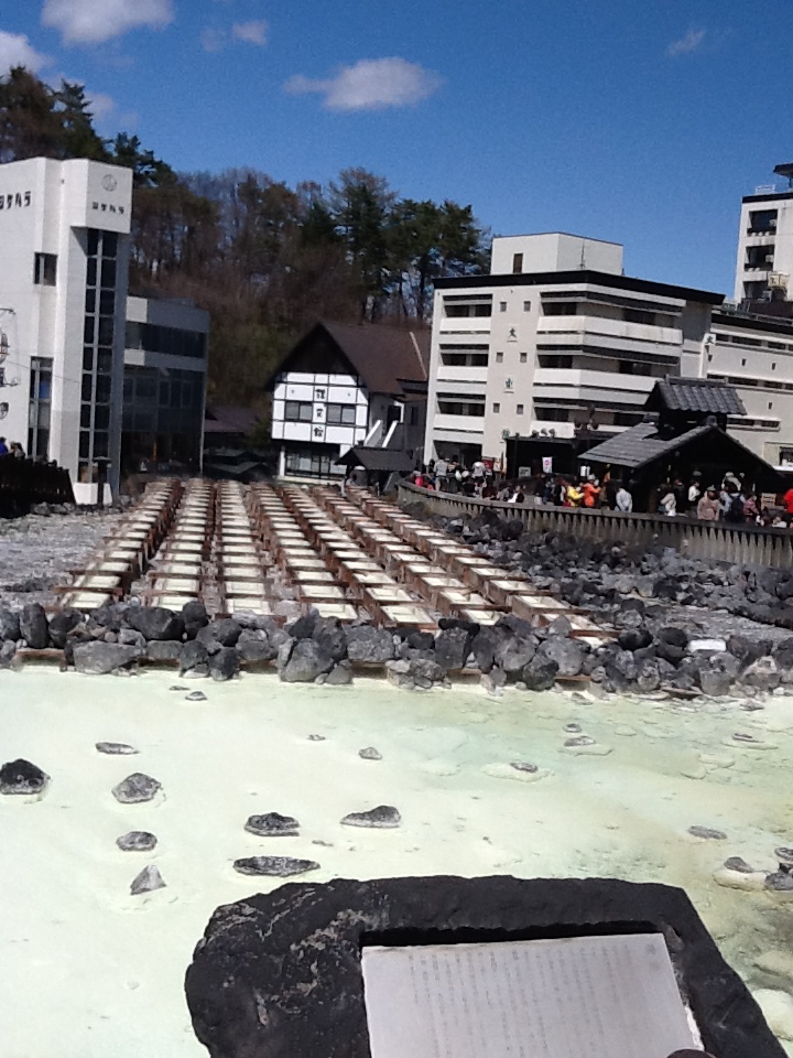 湯畑は、思っていたよりも広く、整然と並んでいました。硫黄のにおいがすごくて、温泉にきたーっと実感しました。