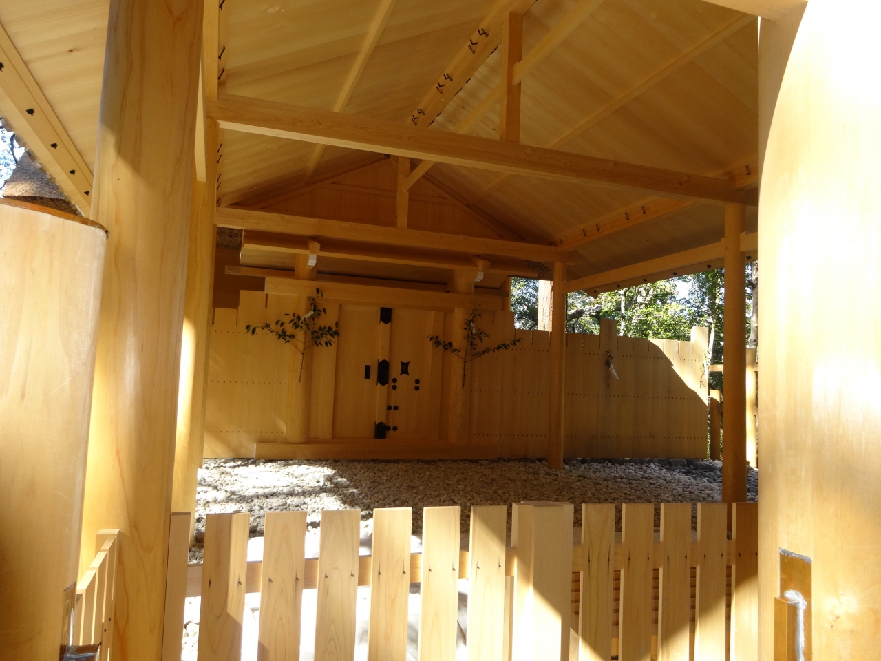 御正殿は内宮と同じく、柵の外からしか見れない&写真も×なのですが(内宮のは「御正宮」といいます)、屋根にある鰹木の数が異なる(外宮のほうが1本少ない)とか、少しずつ異なる造りだそうな。