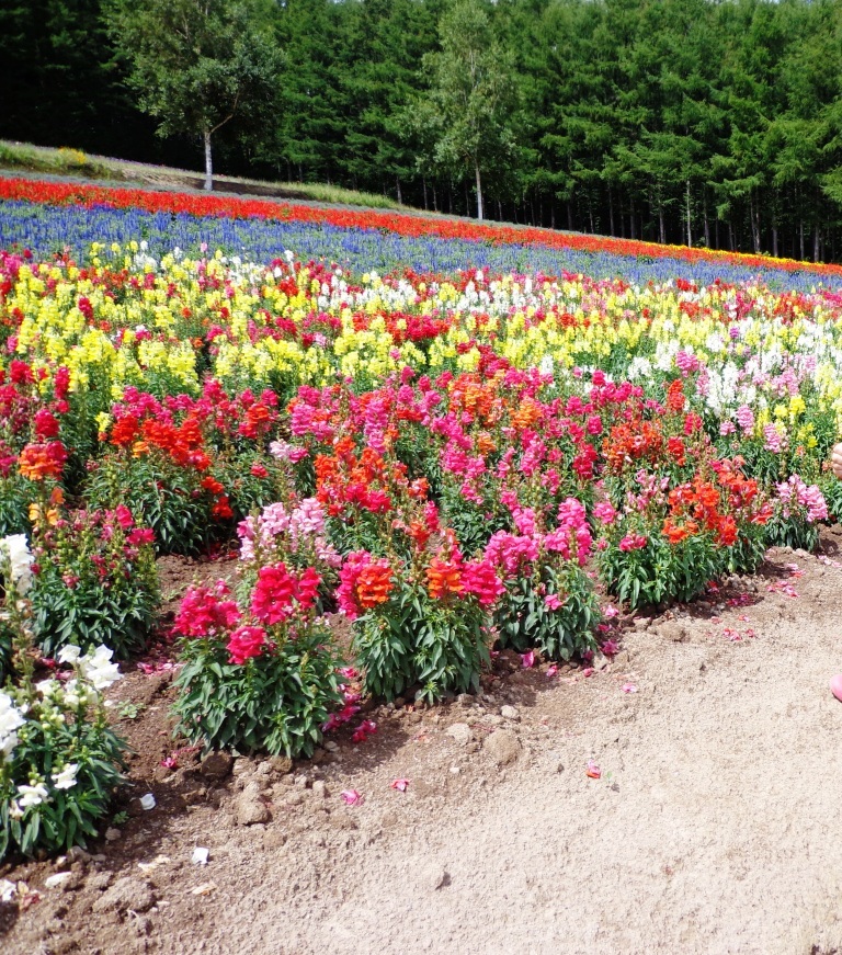 混雑するファーム冨田を避けての「彩花の里」でした。十分な広さの駐車場があり、車を降りればすぐ花畑、ラベンダーの他にも沢山の種類の花々が咲いています。