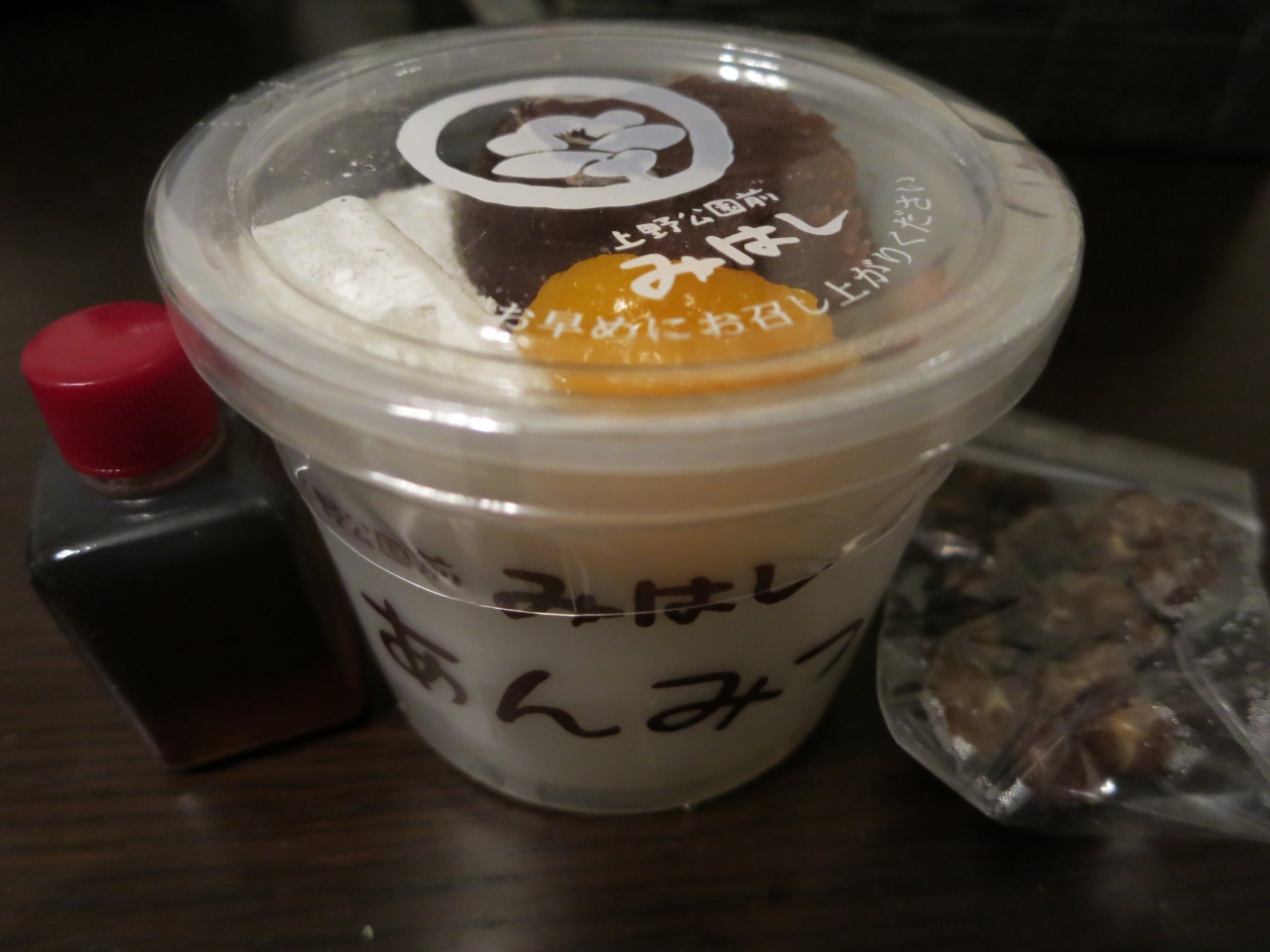上野公園前交差点のヨドバシカメラの並びに甘味所のあんみつ みはしがあります。今回は店の中には入らず、あんみつを買って来ました。あんみつでは他に梅園、鹿の子のを食べたことがありますが、みはしのあんみつは求肥や、ミカン等のトッピングが少なくとてもシンプルで、豆かんの心地良い固さが合います。また、値段も安くGoodです。