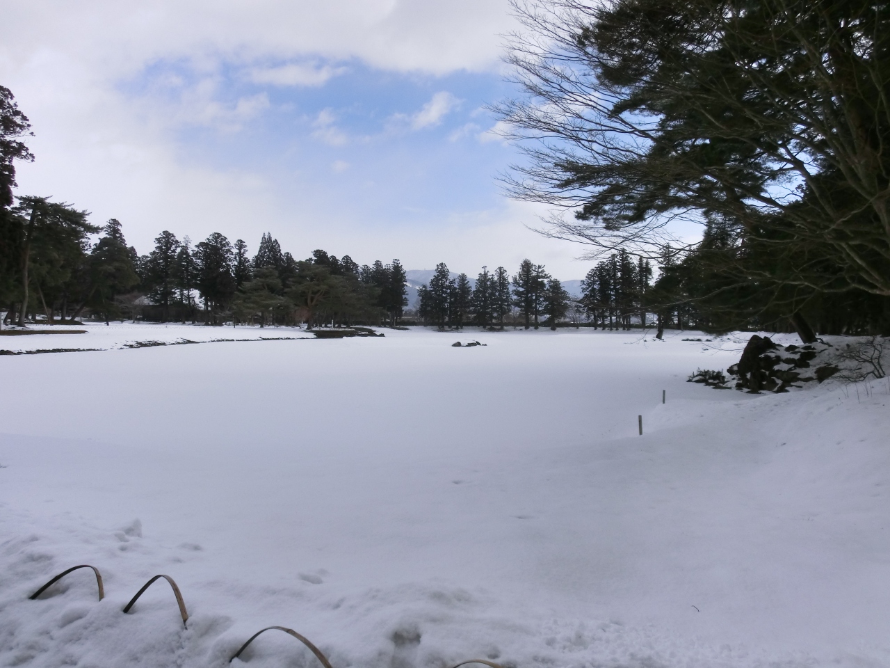 問題はなかったのですが、庭のメインである池が・・・雪が積もっていて