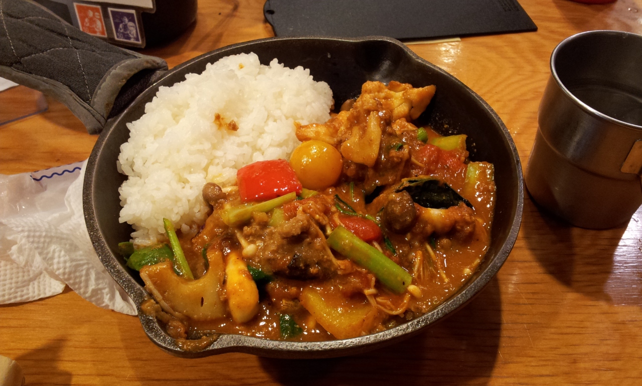 池袋JR駅構内にあるカレー屋さん。一日分の野菜が取れる!とのうたい文句に惹かれて入店。座席はカウンターのみで、女性客が多く見受けられます。カレーはフライパンに盛られて出てきます。辛さは5段階から調節、ご飯の量も調節ができます。辛さは3にして注文しましたが、結構辛く感じました。値段は1000円強と決して安くはないですが、てんこ盛りの野菜は中々ボリューミーでそのぐらいの価値はあると思います。