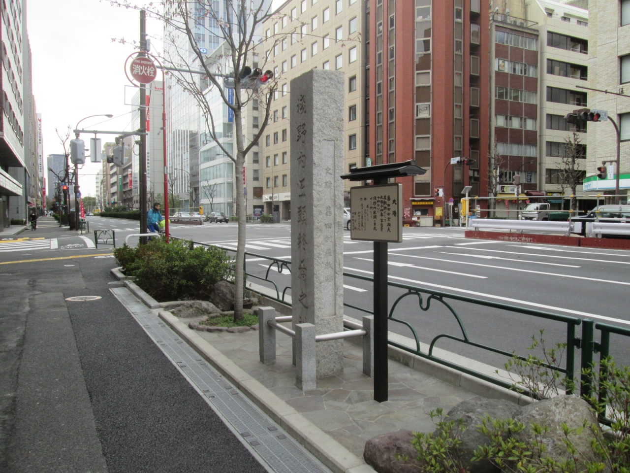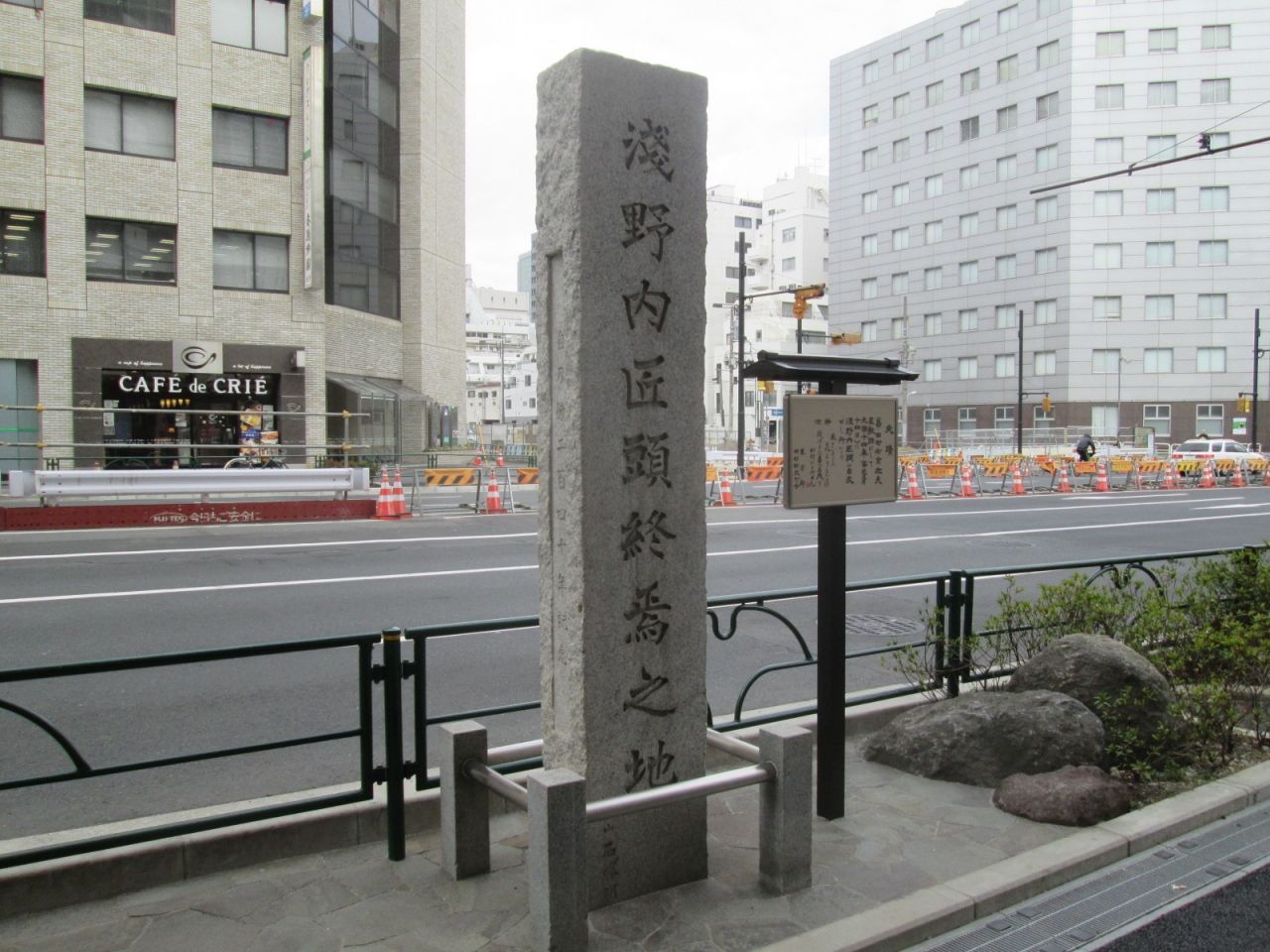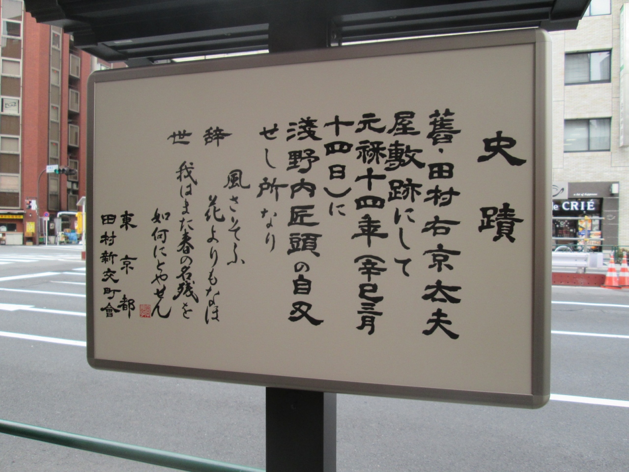 JR「新橋」駅を出て「日比谷通り」をずっと歩いて行くと、「新橋四丁目」交差点近くに碑と立札があります。立札には内匠頭の辞世の句”風さそう花よりもなほ我はまた…”が記されており、あたかもこの場所で切腹したような気がしますが、同時に”田村家屋敷跡”ともあり、碑の側面にも”田村邸跡”と刻まれています。たしかに内匠頭が切腹したのは田村右京太夫の屋敷ですから、この屋敷内で最期を迎えたことだけは確かなのでしょうが…、必ずしもこの碑の辺りで切腹したわけではなさそうです。その辺りをどう捉えるか…。