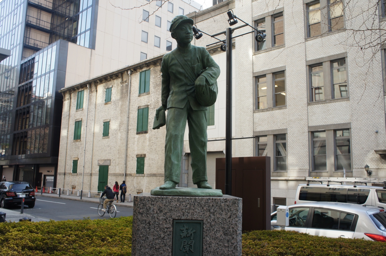 新聞少年の像は、横浜情報文化センターの敷地内。木陰でちょっと分かりにくい場所なんですが、なんとか見つけました。この像は、日本新聞販売協会が、平成16年、創立50周年を記念して、日本新聞博物館に寄贈したもののようです。
