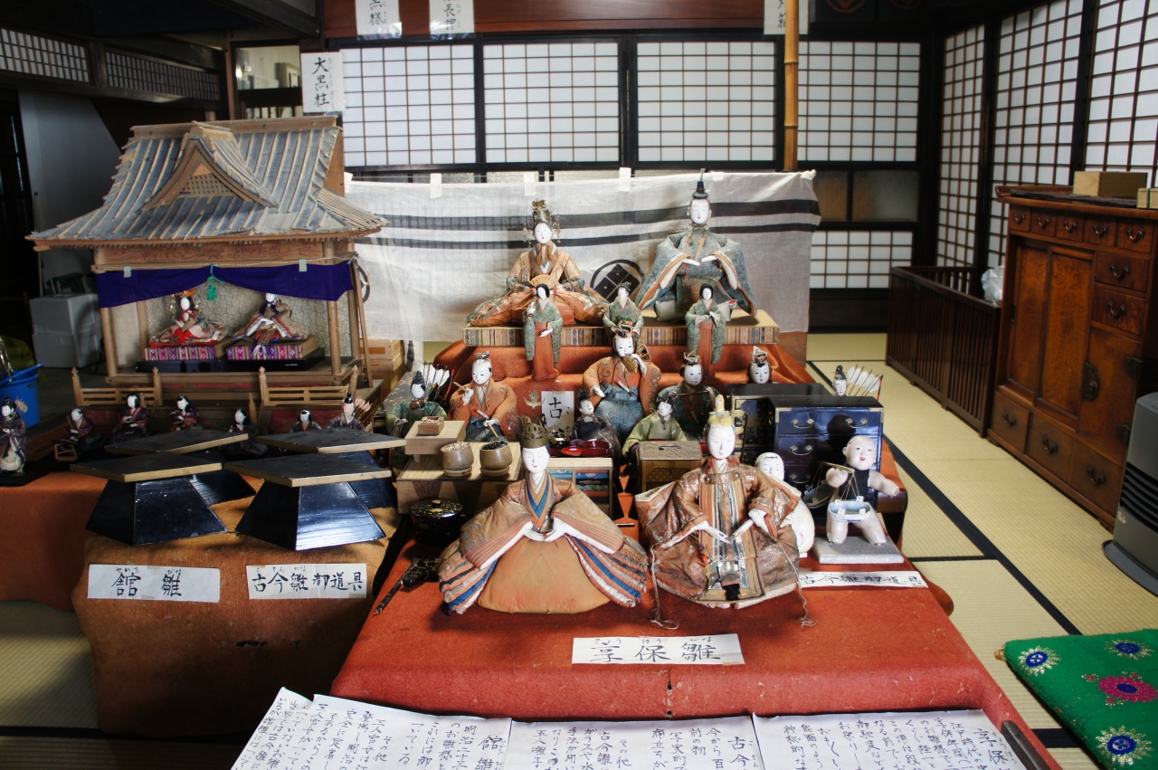 お店の奥の座敷には、享保雛、古今雛に館雛も。シンプルな飾り付けでしたが、返って歴史の重みを語っているような気がしました。