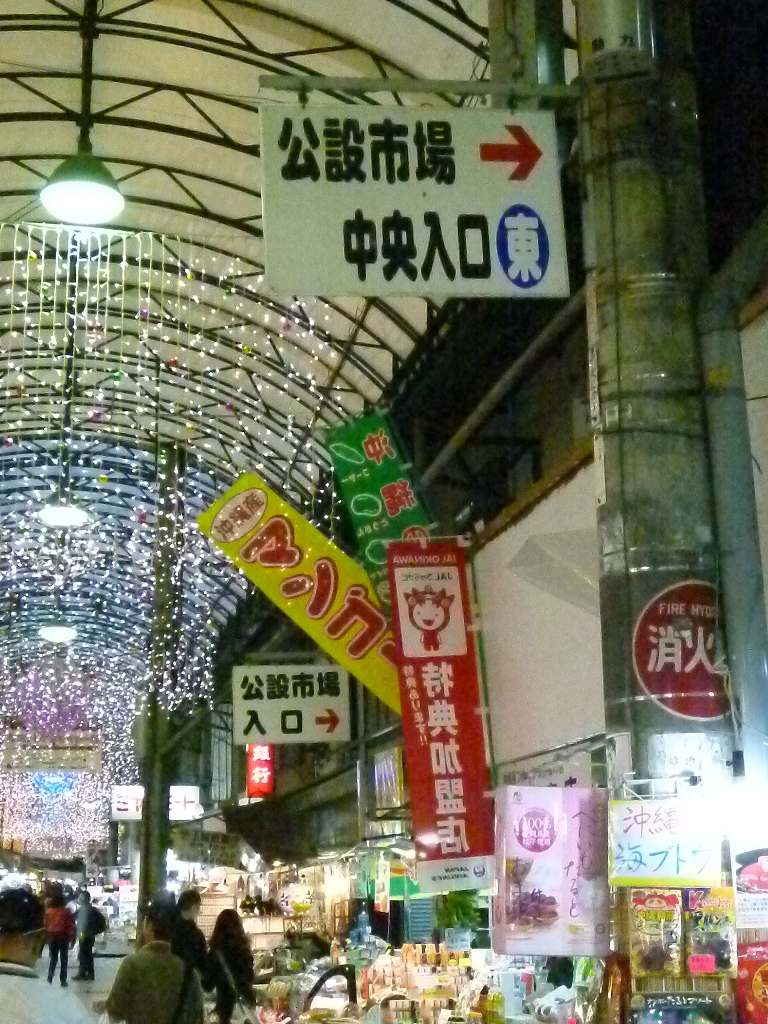 国際通り沿いにあるOPAから入ると「第一牧志公設市場」があります。1階が市場になっていて2階が飲食店です。建物が古く雑然としています。トイレは2階にあります。市民の台所として栄えた市場も、今では観光客向けの店舗が軒を連ねています。1階よりも2階の飲食店は結構にぎわっていますね。