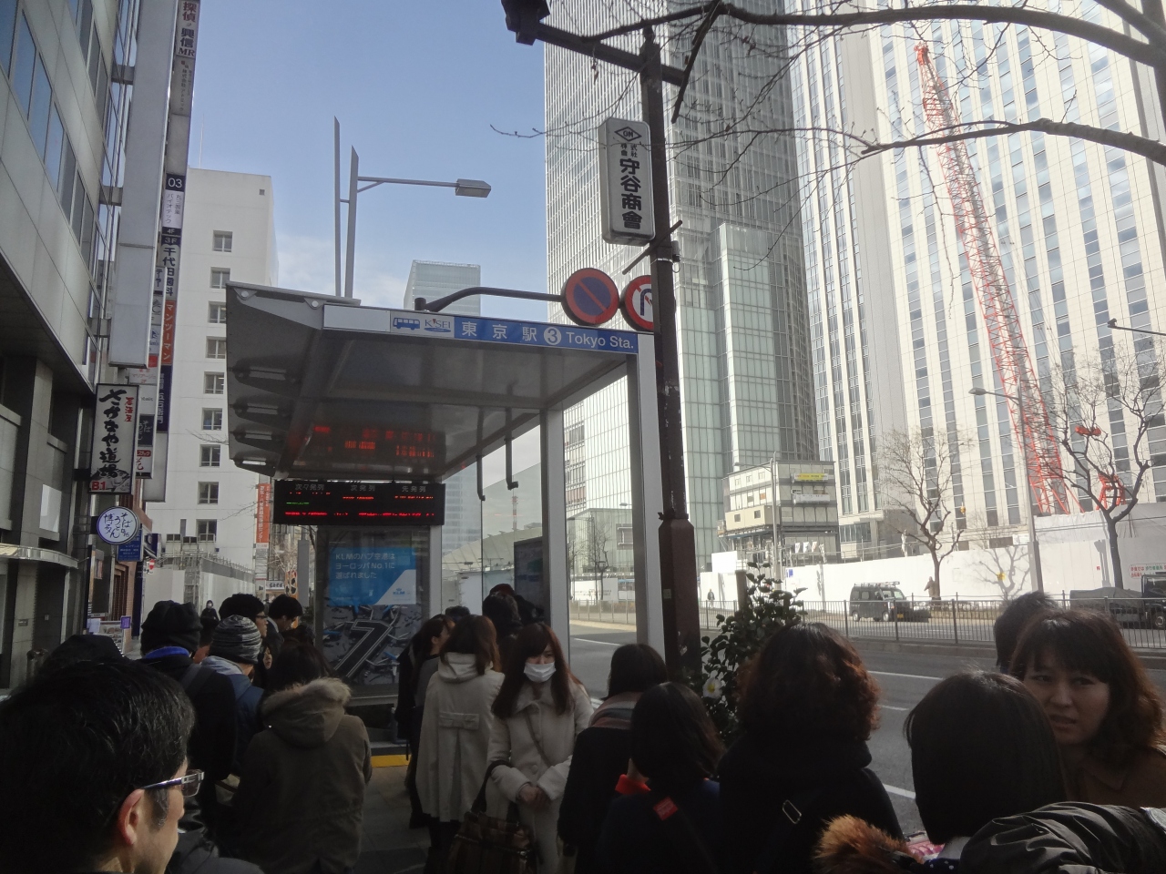 東京発9時の東京シャトルに乗車しました。最近は認知度が上がってきたのか、バス停に着くとけっこう並んでました。乗車するに際しては予約した人が優先的に乗り込み、次いで予約していない人が順番に乗り込みます。この日は予約していなかったので、予約なしの列に並びました。寒い日だったので待つのはちょっと辛かったのと、定員オーバーになりはしないかと心配でしたが、無事に乗り込むことが出来ました。バスは道路の混む時間帯なのか、9時発便のバス停到着が9時5分過ぎで、出発は9時15分くらいに遅れてました。でも出発すれば所要時間1時間程でしたので出発便には十分間に合いました。