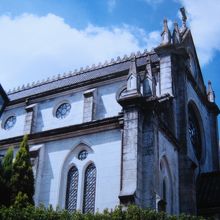 明治村の5丁目、入鹿池に面したところに建っています。明治23年(1890年)京都市中京区河原町三條に建てられたカトリックの教会堂で、フランス人神父の監督の下に、本国から取寄せた設計原案に基づき、日本人の手で造られたものだそうです。レンガ造と木造との併用の白亜の教会は、中に入ると厳かで凜とした雰囲気があり敬虔な気持ちにさせられました。