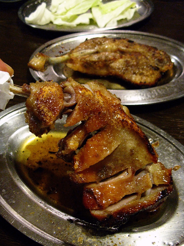スチール皿に旨そうな油の汁に浸かった骨付鶏もも肉。