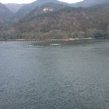 湖底には、大山祇神社がありましたが、ダム建設に伴い湖底に水没してしまうため、近くの山の上にある曲渕城址に移築されました。