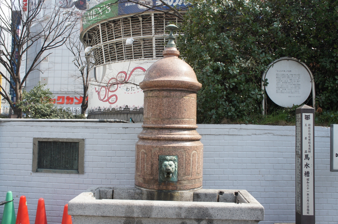 馬水槽は、新宿アルタ前の広場の一角。赤大理石で造られた水槽で、工芸品のように立派です。前面の上部が馬用、下部が犬猫用の水飲み場、その裏面が人間の水飲み場だそうで、宿区指定文化財にもなっています。明治の後期に、ロンドン水槽協会から東京市に寄贈されたものだそうです。