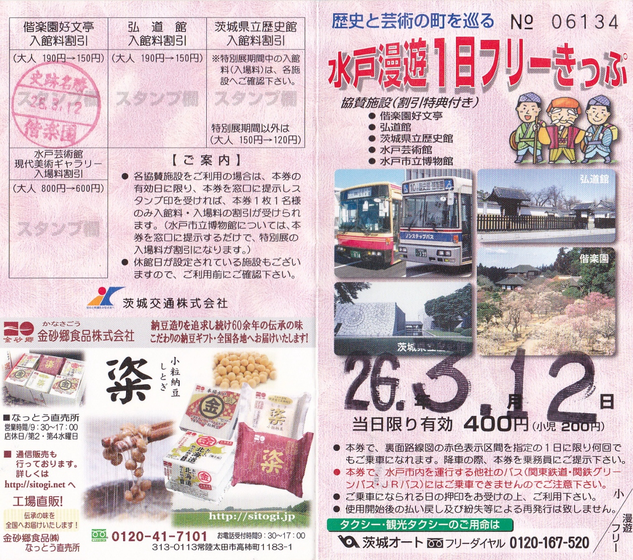 乗る前にバス停に係が「フリーパス」を販売していたので購入。400円。(茨城交通のみ。水戸市内なら何度でも乗り降り自由のパス)