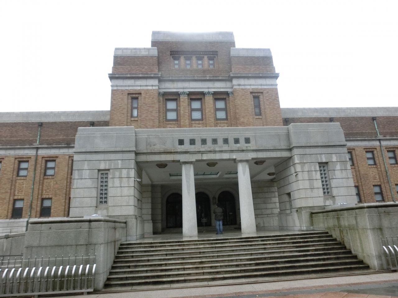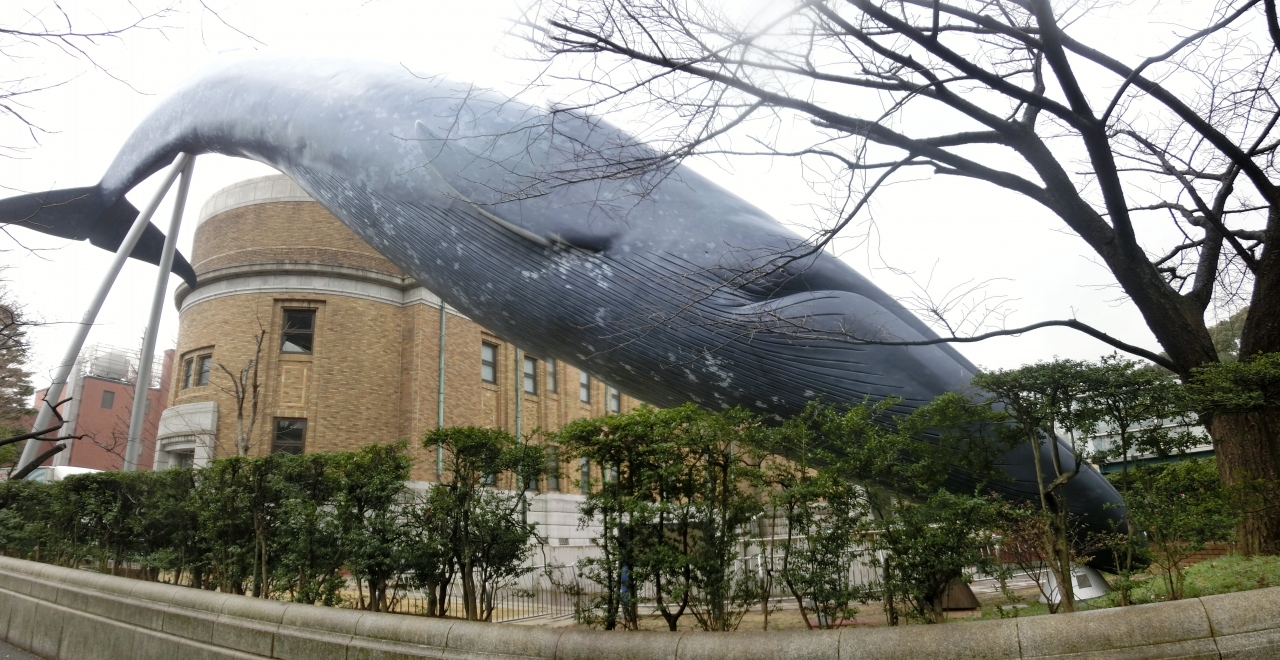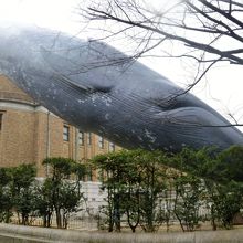 正面横には実物大のような巨大なシロナガスクジラの置物がそそり立って??いて、迫力に驚かされる。
