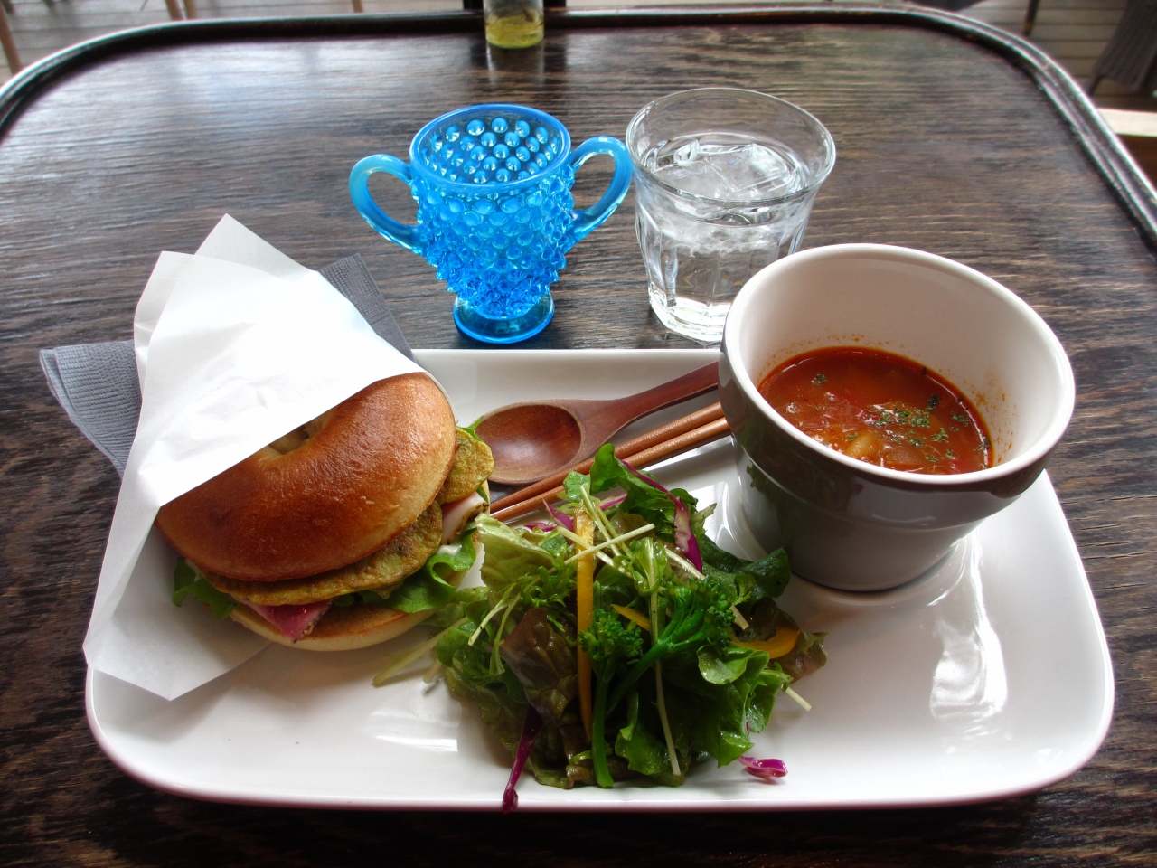 ベーグルを中心としたランチはサラダとスープ、デザートが付いています。