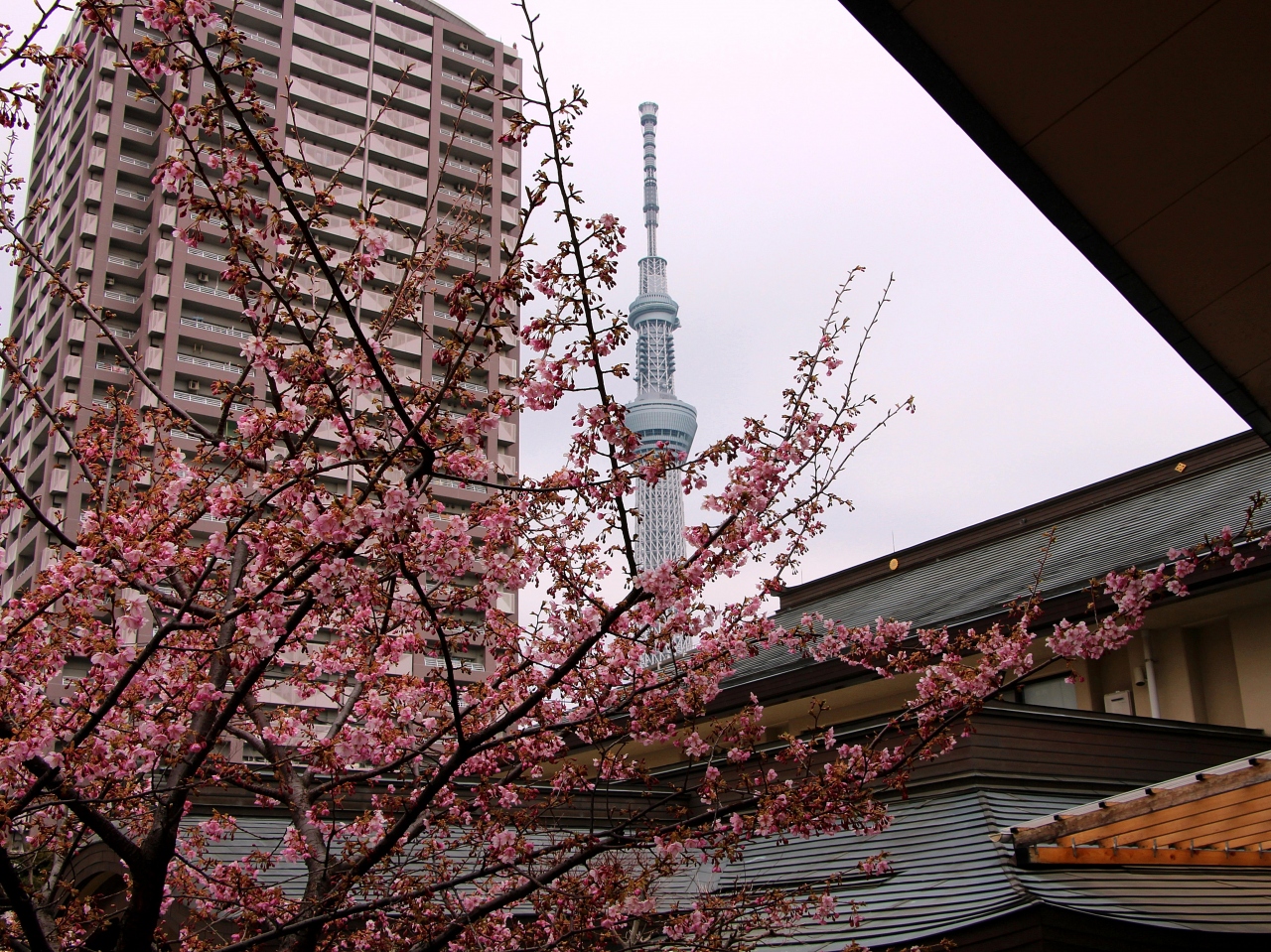 - ピンクの河津桜とスカイツリーのコラボは、なかなか。