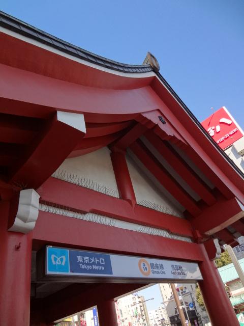 東京メトロ銀座線・浅草駅の地上出口の一つが、朱塗りの建造物として作られ、まるでお寺か神社のような外観になっています。