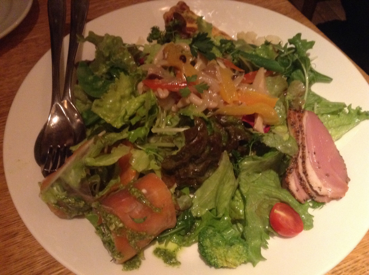 お料理も見栄えはとても、おしゃれ。しかし、残念ながら、サラダの中に、レタスの芯がゴロン。何も言わずに残していたら、もうよろしいですかと。ちょっと、びっくり。そして、隣のお客さんが店員に知り合いだったようで、ドリンクのサービスを。知り合いが来たからちょっとサービスするのはいいかもしれないけど、他の客に気づくようなことは、、、。