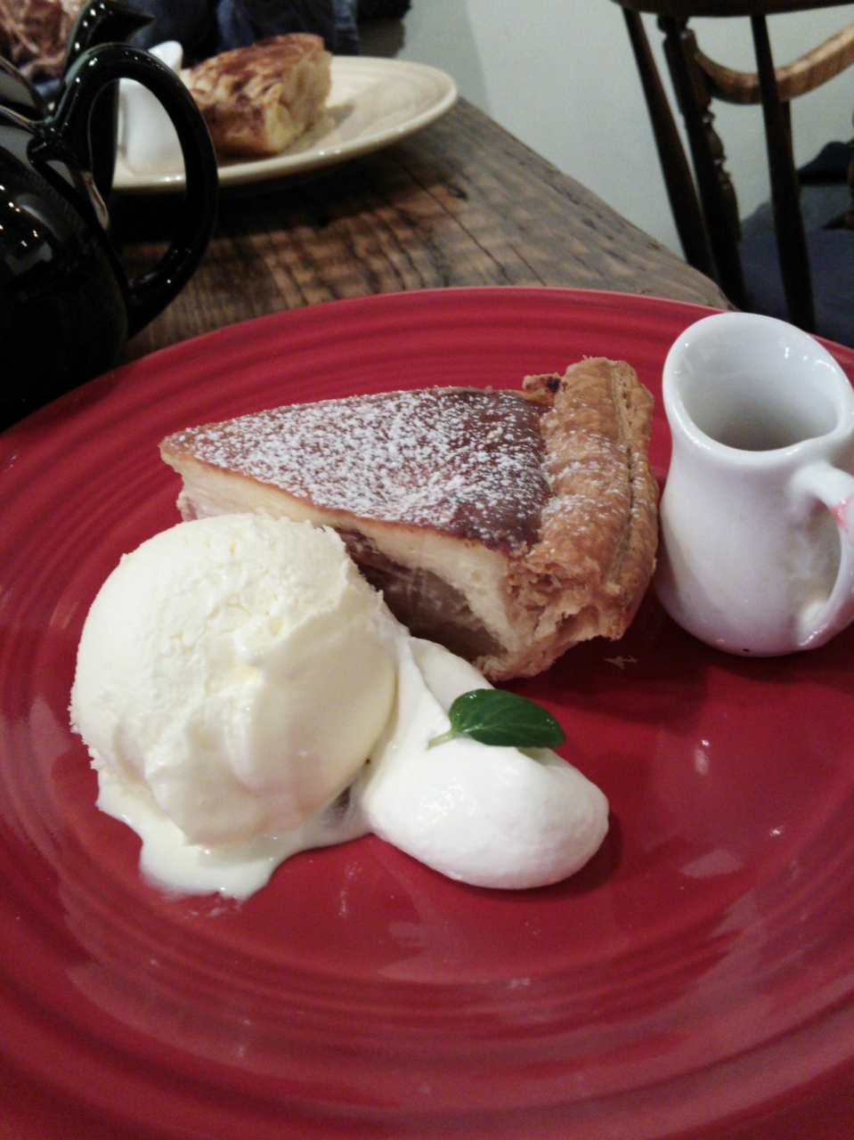 シーズンメニューの”ストロベリーチーズケーキ”をチョイス。紅茶との相性も良いです。メニューの写真から勝手に大きなアップルパイを期待していましたが、お皿の上のパイはやや小ぶりでした。