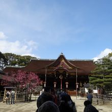 梅が満開でした。有料の梅園もありましたが、境内の中にも無料で見れるスポットがあり、こちらで、満足しました。拝殿の所は、混んでいました。大勢並んでいましたが、団体のガイドさんが、脇からお参りしていいよと話されていたので、並んでる列から離れて脇からお参りしました。