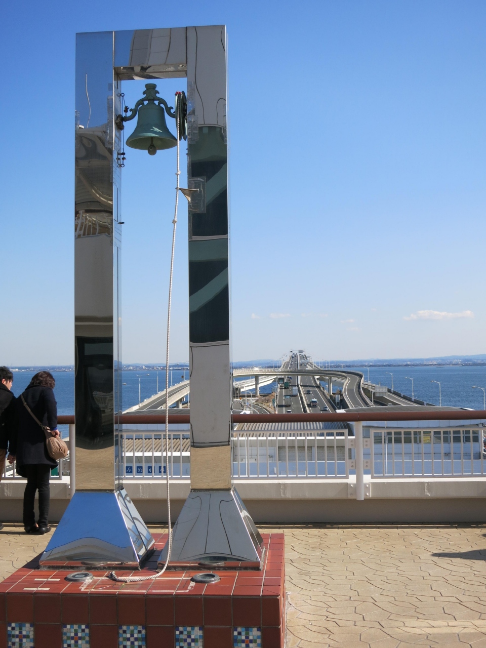 東京アクアラインのパーキングエリア海ほたるの木更津側のデッキに幸せの鐘がある。鐘のつらされた紐を引いて揺らすと鐘が響き、小学生位の子供に喜んで鳴らしていますが、変哲の無いどこにでもある鐘で、神社、仏閣でもないので、御利益もあるのか知らん。
