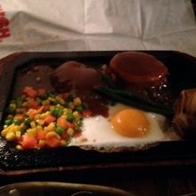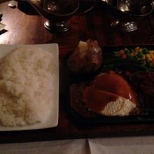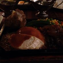 肝心のハンバーグはあつあつの鉄板に載せて提供されます。メニューも色々あって悩みましたが、カマンベールチーズが載った物とトマトのハンバーグにしました。ジューシーでチーズが効いていて旨い~!サイズはレディースセットだと私にはちょっと物足りなかったです。デザートを自由に一つ選べるのですが、デザートコーナーに自分で取りに行くシステムは少し驚きでした。飲み物も紙コップが渡されて自分で取に行くようになってます。お客さんには若い人が多かったのでこういうのでも良いのかな。