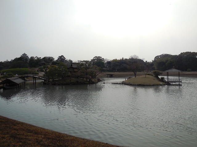明るく開けた感じの庭園でした。池、建物、芝生に沿って遊歩道があり、のんびりと散策できました。茶畑、梅林などもあり、昔は田畑がほとんどを占めていたという説明が載っていました。池には鯉が泳ぎ、入り口近くのところに丹頂鶴が水浴びをしていました。