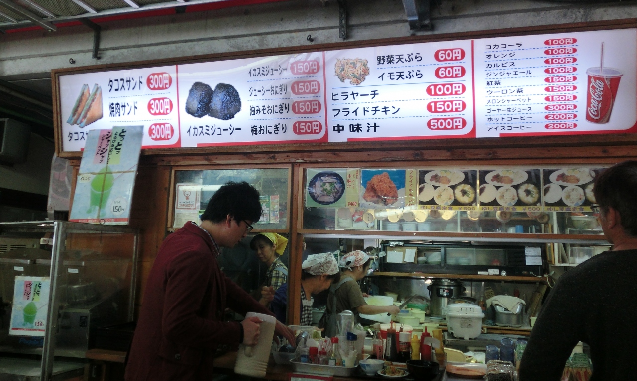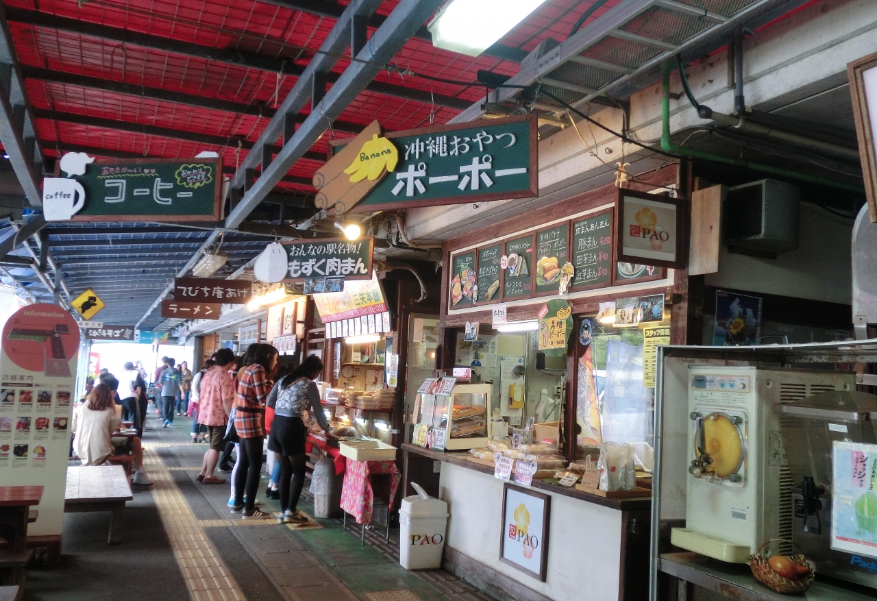「豚三郎」で「てびち唐揚げ」、「恩納村水産物直売店」では「うにソースのムール貝」「各種天ぷら」、他にもタコスサンド、ジュシーおにぎりを買い、テーブル席で食べました。他にもソーキそばなどよりどりで、観光地価格ではなくお手頃価格でリーズナブルでした。