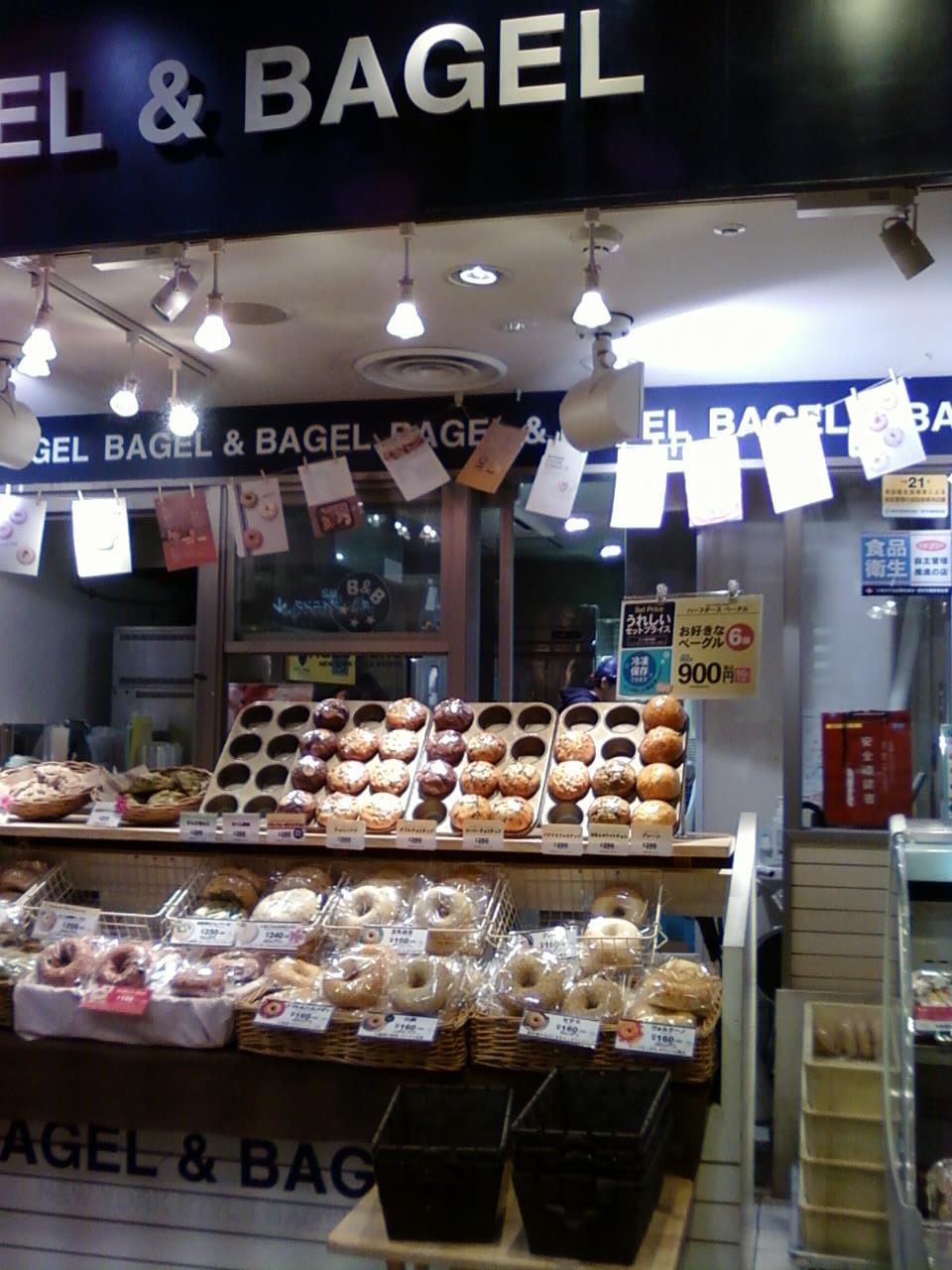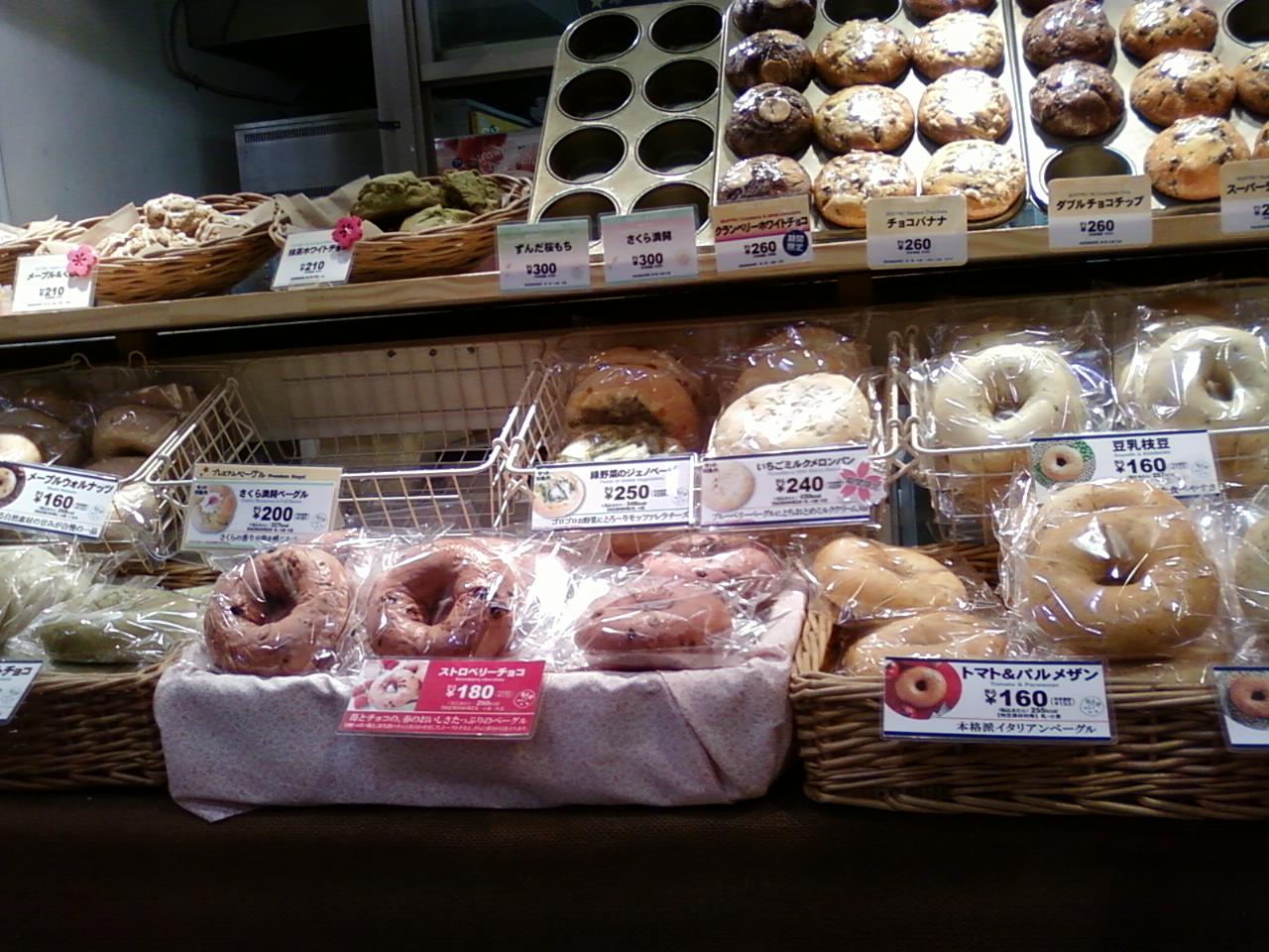 ここのベーグルベーグルさんは、横浜駅西口に直結している、相鉄ジョイナスの地下一階にあります。味彩小町の一角です。奥行きはあるみたいですが、間口はとても狭い店頭に、たくさんの種類のベーグルがところ狭しと並べてあります。季節に合わせていろんな種類を入れかえているので目がはなせません。おすすめはもちもち感のある豆乳枝豆ベーグル。それからワインに合う、トマト&パルメザンですね。今はストロベリーチョコベーグルが注目商品でした。