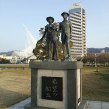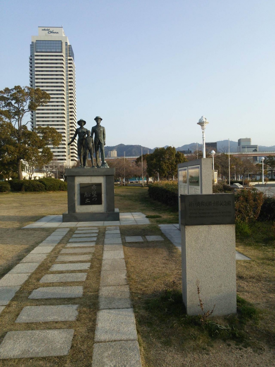 メリケンパークの中にある、神戸港移民船乗船記念碑が、ちょうど海の方へ向って建っています。