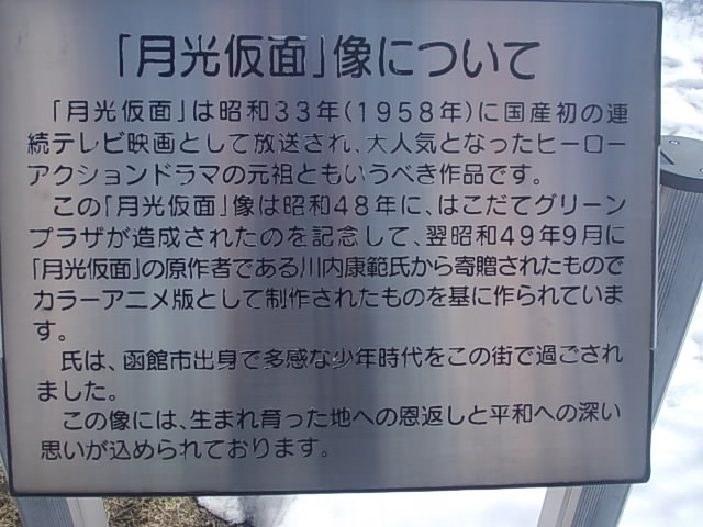 テレビ黎明期の時代のヒーローとして、プロレスの力道山と双璧に数えられるのが月光仮面ですが、実際その世代をリアルタイムに知らない身には、今一つ印象の薄いヒーローでした。しかし函館には、ユニークな月光仮面像が設置されていて、ストーリーを知らなくても、雰囲気だけは楽しむことが出来ました。函館駅からも近いので、話のタネに是非足を運んでみて下さい。
