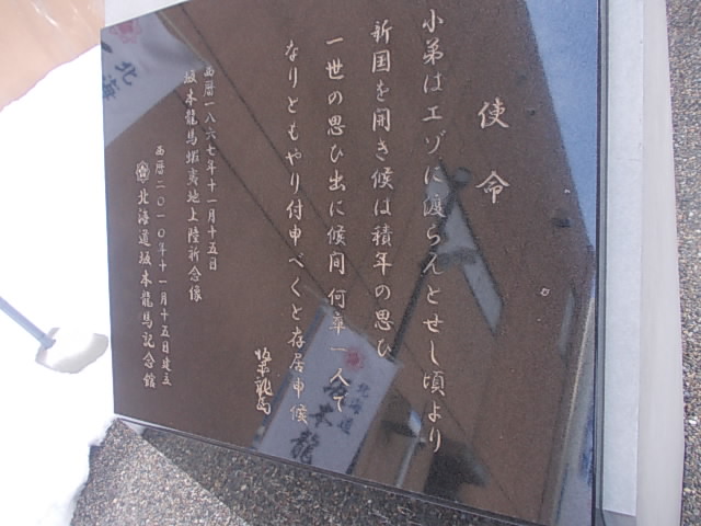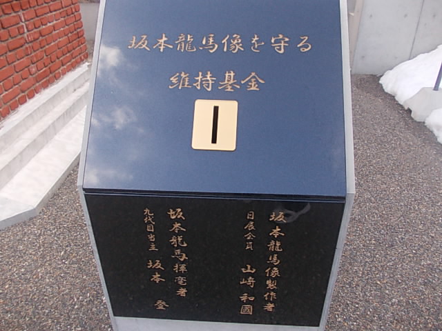 ここは記念館の向かいにあって、指を立てて堂々と建っている姿が印象的な像ですが、像の脇に目をやると、募金ができるようになっていました。ちゃっかりしているなと思いつつも、記念館に寄らずに像だけ拝んで帰る方にとっては、ある意味記念館の入場料を志納で納めるようなものかな、等と思ってしまいました。坂本龍馬人気にあやかった商売の一種と言えるかもしれません(笑)。